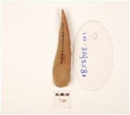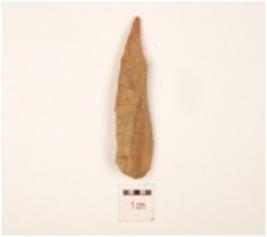 | Description / विवरण | A chert point with double ridge on dorsal, trapezoidal cross-section and pointed distal end. |