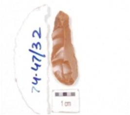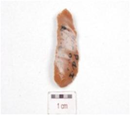 | Description / विवरण | A blade made on chert, mid ridge on dorsal side, diffused bulb on ventral side and use wear marks on edges. |