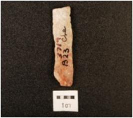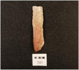 | Description / विवरण | Blade with parallel sides working edge, flake scar on dorsal side, striking platform at proximal end and prominent bulb on ventral side, broken at distal end. |
