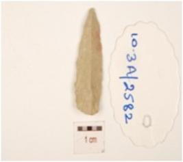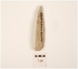 | Description / विवरण | A chert blade, prominent mid-ridge on dorsal, prepared platform, bulb on ventral surface, triangular cross-section and use wear marks on cutting edge. |