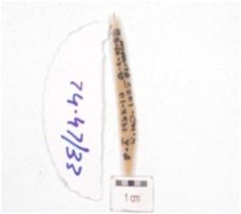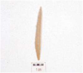 | Description / विवरण | A knife shape blade made on chert, mid-ridge on dorsal side, diffused bulb on ventral side and use wear marks on edges. |