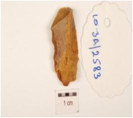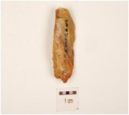 | Description / विवरण | A chert blade with prominent mid-ridge on dorsal, triangular cross-section and irregular retouches on cutting edge. |