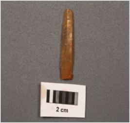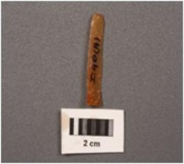 | Description / विवरण | Heat treated chalcedony parallel sided blade with a single mid ridge, triangular section, used layer marks on cutting edges. |