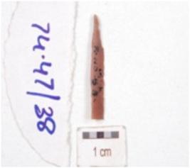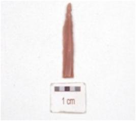 | Description / विवरण | A blade made on chert, mid-ridge on dorsal side, diffused bulb on ventral side and use wear marks on edges. |