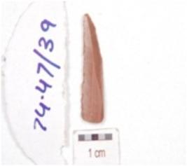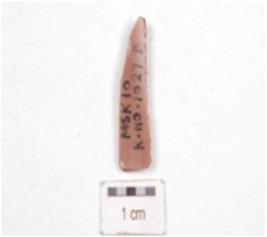 | Description / विवरण | A knife shape blade made on chert, mid-ridge on dorsal side, diffused bulb on ventral side and use wear marks on edges. |