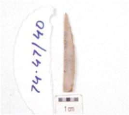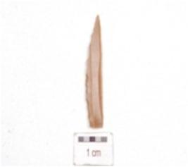 | Description / विवरण | A knife shape blade made on chert, double ridge on dorsal side, diffused bulb on ventral side and use wear marks on edges. |
