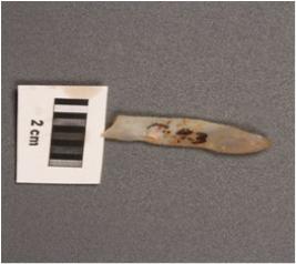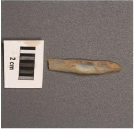 | Description / विवरण | Pen knife blade made on chalcedony with double ridge on dorsal side and diffused bulb on bentral side along with proximal end. Distal end is sharp, use wear marks on both edges |