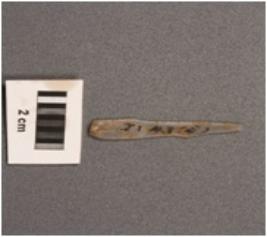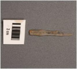 | Description / विवरण | Parallel sided microlithic blade with use wear marks on cutitng edges, ridges on dorsal surface, prominent bulb on proximal end, pointed distal end. |