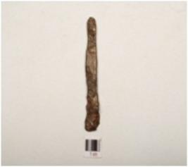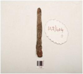 | Description / विवरण | A nail made of iron elongeted body flat broad one end, intact other end, intact other end, flat surface, slightly damaged at one end, rectangular in section, chemically treated. |
