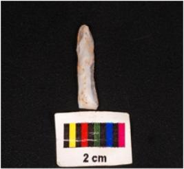 | Description / विवरण | Parallel sided blade made on chalcedony stone, wavy ridge on dorsal surface, ventral surface is smooth and diffuse bulb at proximal end, use wear marks on edge. |