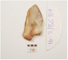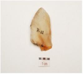| Description / विवरण | A utilized flake made of chalcedony, bulb on ventral and use wear marks on working edges. |