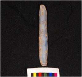 | Description / विवरण | Parallel sided blade, made on chalcedony stone, mid ridge on dorsal surface, ventral surface, diffuse bulb at proximal end use wear marks on edge. |