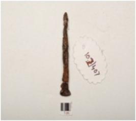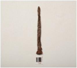 | Description / विवरण | A nail made of iron, elongated body flat broad one end, pointed other end, chemically treated surface, rectangular in section. |