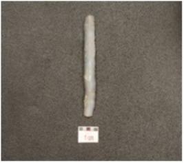 | Description / विवरण | A blade made of chalcedony, single ridge on dorsal, use wear marks on working edges and triangular cross section. |