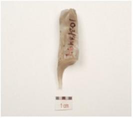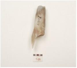 | Description / विवरण | A blade made of chalcedony, single ridge on dorsal side, use wear marks on working edges and triangular cross section. |