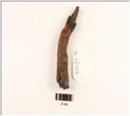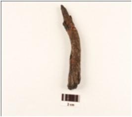 | Description / विवरण | Iron nail, chipped off surface, mended on one side, circular in section, pointed at one end, slightly curved. |