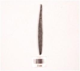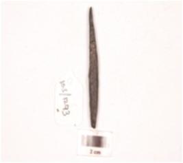 | Description / विवरण | Fragment of a point on charred bone, both ends pointed broad at the middle, polished surface, rectangular section, broken end fixed with glue. |