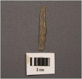 | Description / विवरण | Parallel sided blade, use wear marks on both working edges, prrominant bulb, one vertical ridge on dorsal surface, concave ventral surface. |