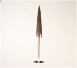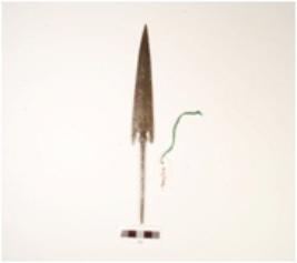| Description / विवरण | An iron arrow head with tang, pointed top, thin round tang with pointed end, flat head with proper edges, polished. |