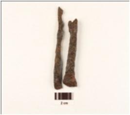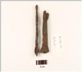 | Description / विवरण | A Iron nail, uneven flat surface, chemically treated rectangular in section, pointed at one end other end broken. B Fragment of iron nail head, rectangular in section, flat surface, broken form one end broad other end. |