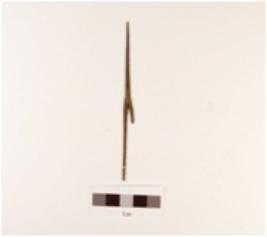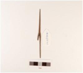 | Description / विवरण | Fragment of copper arrow head, pointed top and end, attached two pins, one is half broken, thin in character, polished. |