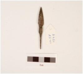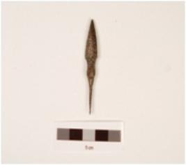 | Description / विवरण | A fragment of iron arrow head, with tang, diamond shaped surface with pointed top, narrow from middle, round thin tang with pointed end, polished, ridge on surface. |