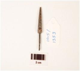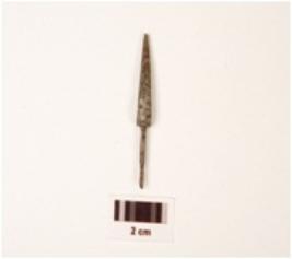 | Description / विवरण | Fragment of an iron arrow head with tang, pointed top, square button and surface, thin round tang with pointed end, rough surface, proper edges, polished. |