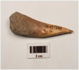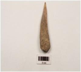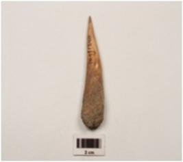 | Description / विवरण | A bone borer with smooth surface, its ends are pointed cracks are on surface and brown in colour, grooved on bottom. |