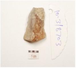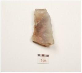 | Description / विवरण | A utilized flake made on chalcedony, prepared platform on proximal end, bulb on ventral side and use wear marks on working edges. |