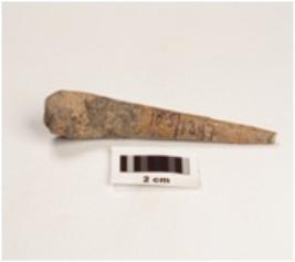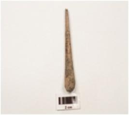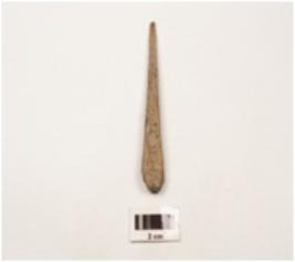 | Description / विवरण | A bone point made with modifed bone, both end is pointed, surface is rough, and brown in colour. |