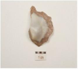 | Description / विवरण | An utilized flake made of chalcedony prepared platform on proximal end and use wear marks on working edges. |