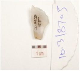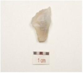 | Description / विवरण | A utilized flake made of chalcedony, bulb on ventral side, flake scars on dorsal side and use wear marks on working, edges. |