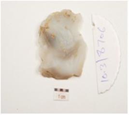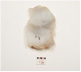 | Description / विवरण | A utilized flake made of chalcedony, prepared platform on proximal end and diffused bulb on ventral use wear marks on working edges. |