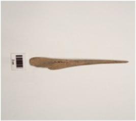 | Description / विवरण | A modified bone awl with pointed ends, cracks on surface, smooth and brown in colour, grooved on bottom and flat end. |