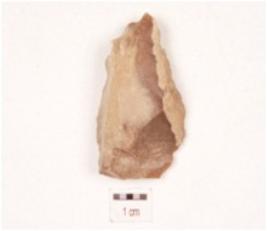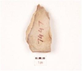 | Description / विवरण | Flake made of chert, prepared platfrom, flake scars on the surface and wavy edges. |