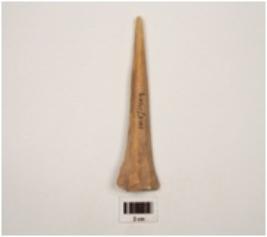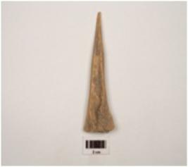 | Description / विवरण | A small modified bone point with pointed end and smooth surface and brown in colour, cracks are visible, grooved on surface. |