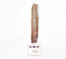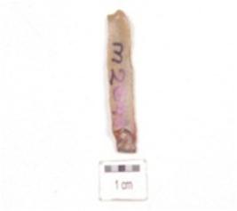 | Description / विवरण | Chert blade, prepared platform, prominent bulb and use-wear mark along the cutting edge. |