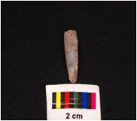 | Description / विवरण | Parallel sided blade with single ridge on dorsal surface, diffuse bulb on ventral surface, broken along distal end, detouched from prepare core, core given heat treatment, use-wear marks along cutting edge. |