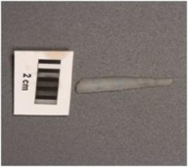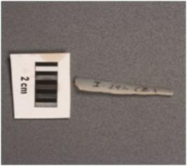 | Description / विवरण | A point made on chalcedony blade, single mid ridge on dorsal surface, triangular section, used layer marks on cutting edges. |
