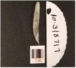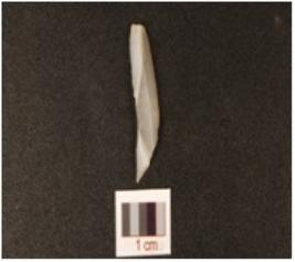 | Description / विवरण | Parallel sided blade made of chalcedony, prepared platform use wear marks on the working edges and triangular section. |