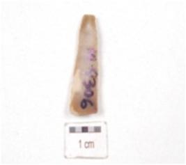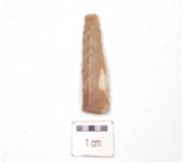 | Description / विवरण | A chert blade, trapezoidal cross-section, prepared platform, prominent bulb on ventral side and retouched cutting edge. |