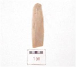 | Description / विवरण | A chert blade, trapezoidal cross-section, prepared platfrom, prominent bulb on ventral side, distal end broken and use-wear marks along the cutting edges. |