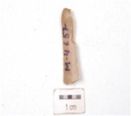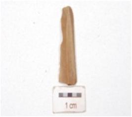 | Description / विवरण | Fragment of a parallel sided blade, made on chert, prepared platform on proximal end, broken along distal end, bulb on ventral side and double ridge on dorsal side. |