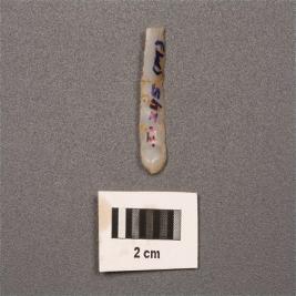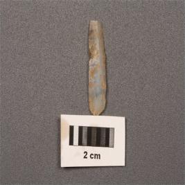 | Description / विवरण | Chalcedony parallel sided blade with a single mid ridge on dorsal surface, used layer marks on cutting edges, triangular section, bulb on ventral surface. |