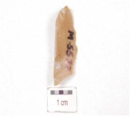 | Description / विवरण | A chert blunted blade, triangular cross-section, prepared platform, prominent bulb on ventral side and use-wear marks along the cutting edge. |
