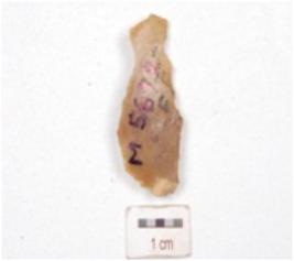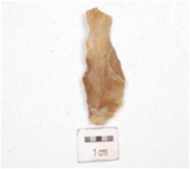 | Description / विवरण | Fragment of a blade, made on chert, prepared platform on proximal end, diffused bulb on ventral side and blade scars on dorsal side. |