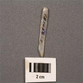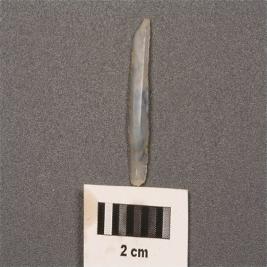 | Description / विवरण | Parallel sided microlithic blade with use wear marks on cutitng edges, two ridges on dorsal surface, prominent bulb on proximal end, broken distal end. |