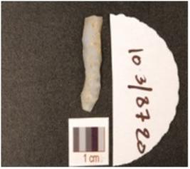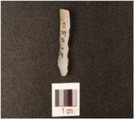 | Description / विवरण | Parallel sided blade made of chalcedony, prepared platform and use wear mark on the working. |