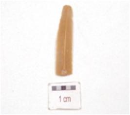 | Description / विवरण | A chert blade, triangular cross-section, prepared platform, bulb absent and use-wear marks along the cutting edges. |