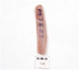 | Description / विवरण | A parallel sided blade, made on chert, prepared platform on proximal end, bulb on ventral side, ridge on dorsal side and use-wear marks along cutting edges. |